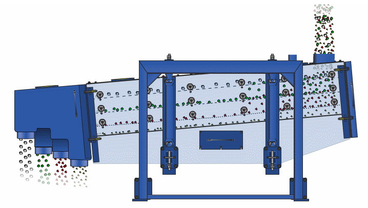 方形搖擺篩啟動后,篩機(jī)搖動體即篩箱在慣性力的作用下做前后往復(fù)運(yùn)動,篩箱帶動篩面做周期性搖動,從而使篩面上的物料隨篩箱一同做定向跳躍式運(yùn)動,期間,小于篩面孔徑的物料通過篩孔落到下層,成為篩下物,大于篩面孔徑的物料經(jīng)連續(xù)翻滾跳躍運(yùn)動后從排料款排出,完成篩分工作。